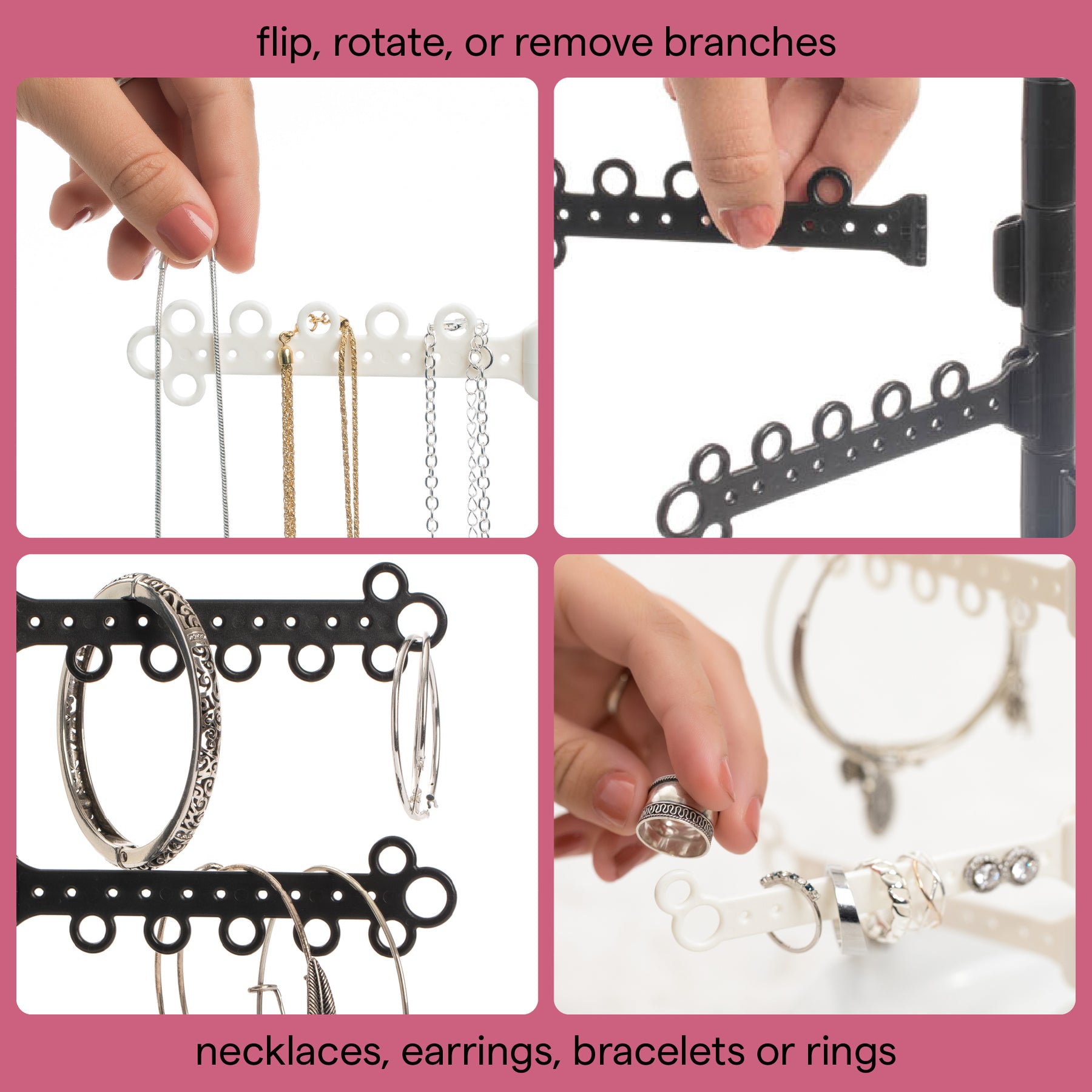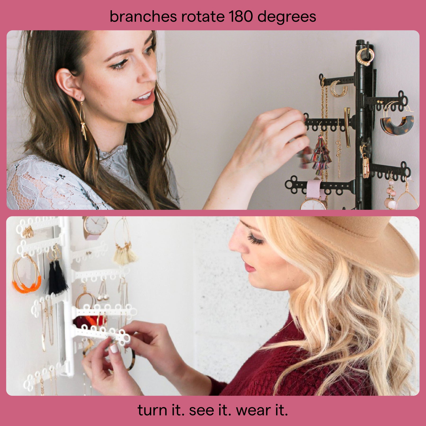 Easy hanging: Command Strips included for wall, closet, door, or mirror. Tangle-free necklace holder stand. Branches rotate 180 degrees, flip over for earrings or bracelets, and remove for travel.